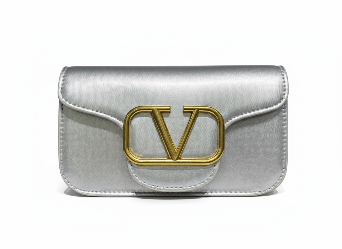 Produzida em material metálico prateado de brilho sutil, destaca-se pelo icônico logo “V” dourado, símbolo de elegância atemporal.